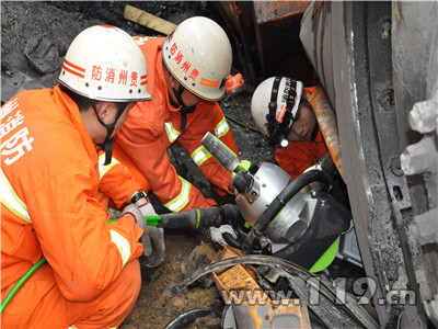 到達現場經偵察發現一輛滿載煤渣的大貨車側翻在路邊的高坎下,高坎大概有四五米,灑落的煤到處都是,且該車油箱正在漏油,有一人被困于駕駛室,身體被困住下半身無法動彈,副駕駛的門框死死地卡住了傷員的腿使其無法爬出駕駛室。見狀,指揮員立即下令對車門先進行擴張,使其能將傷者的腿能先放松,減輕傷者的疼痛感。然后,再用液壓撐桿對變形的駕駛室進行擴張,創造更大的操作空間,再由一人對傷者進行安撫,防止情緒激動做出其他過激的事;時間在流逝著,天空已經開始下起了毛毛細雨;約一個半小時后,吊車到場,剛升起吊臂還未對掛鉤進行固定,就聽見里面的戰士大喊,別吊,來兩個人幫忙抬一下;原來在這幾分鐘里,消防官兵已經將被困者救出。