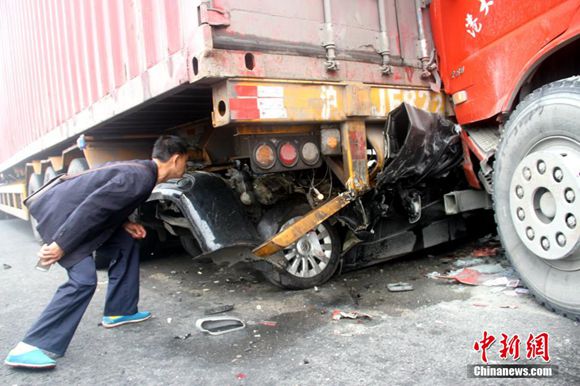 3月29日,一名男子正在成都繞城高速事故現場查看受損的車輛。中新社發 鐘欣 攝