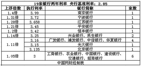 數據顯示,19家銀行中,目前尚未有一家銀行上浮至1.5倍。其中,城商行和股份制銀行對執行利率上浮更加積極,南京銀行的7檔利率均為最高水平,有4檔期利率上浮至基準利率的1.4倍。而五大行有3檔利率都僅采取基準利率,在另外3檔利率上,最高的也就上浮了1.12倍。另外,交通銀行有3檔利率均超過其他四大行0.05個百分點。