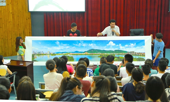 講座中,吳少鋒先生以攝影術(shù)的誕生以及攝影在中國的發(fā)展為切入點,圍繞“如何利用好你手中的相機”這一問題進行了深入淺出的講解。通過對數(shù)碼相機的發(fā)展、攝影的取景、構(gòu)圖等攝影基礎(chǔ)理論知識的介紹,重點分析了光圈先決模式、快門先決模式兩種程序模式的優(yōu)勢和適用情境,并強調(diào)了攝影過程中光線合理運用的重要性,詳細闡述并展示了逆光、側(cè)光、側(cè)逆光等不同光線條件下拍攝出的照片的差異。此外,他還就接片技術(shù)、攝影作品與書法的結(jié)合、攝影畫冊的制作等問題與同學(xué)們進行了深入的探討。在講述每一個知識點時吳少鋒先生都輔以大量的圖片,通過實例來讓聽眾們更好地理解。在講座過程中,他展示了收藏在閩臺緣博物館的長幅攝影作品《泉州古城展新姿》的五米縮略版,讓在座聽眾驚嘆不已。