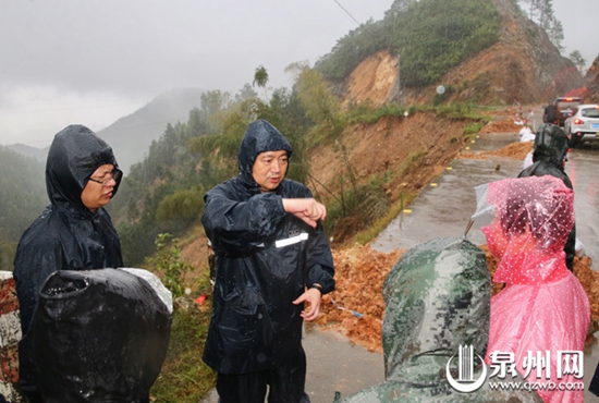 “鲇魚”給安溪、永春、德化等山區(qū)縣帶來了嚴峻的雨情。在瓢潑大雨中驅(qū)車兩個半小時后,鄭新聰來到水口鎮(zhèn),詳細了解災(zāi)情,部署安排搶險工作。隨即,他又趕往塌方路段——水口鎮(zhèn)區(qū)通往梨坑村的交通要道。昨晚到早上八點內(nèi)300多毫米的降水導(dǎo)致山洪爆發(fā),前往梨坑村道路被沖毀,大面積路面被掏空,車輛無法通行。鄭書記涉水步行出入現(xiàn)場,對救災(zāi)工作提出具體要求。