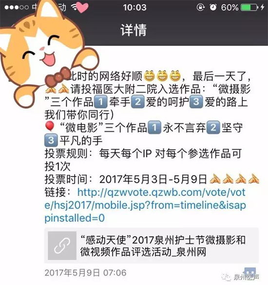 由泉州市衛計委、泉州晚報聯合主辦的“感動天使”2017泉州護士節微攝影和微視頻作品評選和展播活動?;顒娱_展以來,共征集到135件微攝影、35件微視頻作品,經過專家評選及網絡投票,現已圓滿結束。相信、大家都很期待最終結果吧?