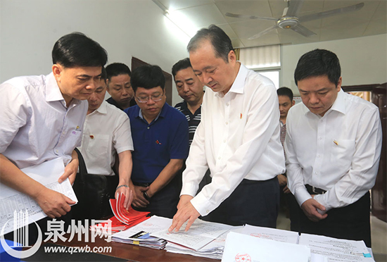 在安溪縣金谷鎮和南安市金淘鎮,市委書記、市人大常委會主任鄭新聰(前排中)都翻閱了鎮里的扶貧手冊、臺賬,檢查扶貧工作落實情況。(陳起拓 攝)