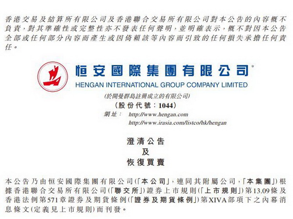 針對12月12日沽空機構Bonitas Research(博力達思,以下簡稱“Bonitas”)對外發布的做空報告,恒安國際于12月13日上午對外發布澄清公告,對此作出正面回應,并向聯交所申請恢復交易。
