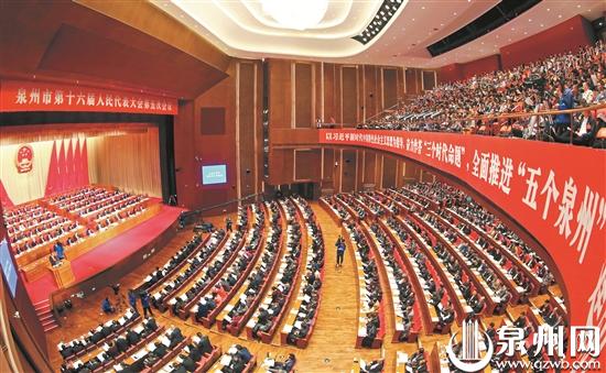 嶄新的泉州人民會堂雄偉莊嚴,會場氣氛隆重熱烈,主席臺正中懸掛著中華人民共和國國徽,鮮艷的紅旗分列在兩側(cè)。會場中央的標語鼓舞人心:以習近平新時代中國特色社會主義思想為指導,奮力作答“三個時代命題”,全面推進“五個泉州”建設!