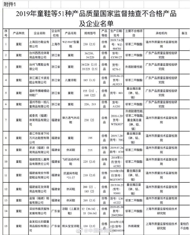 2019年12月31日,國(guó)家市場(chǎng)監(jiān)督管理總局官網(wǎng)通報(bào)2019年童鞋等51種產(chǎn)品質(zhì)量國(guó)家監(jiān)督抽查不合格產(chǎn)品及企業(yè)名單。其中,上海回力鞋業(yè)有限公司生產(chǎn)的WZ-9047型童鞋樣品,被查出含有鄰苯二甲酸酯。