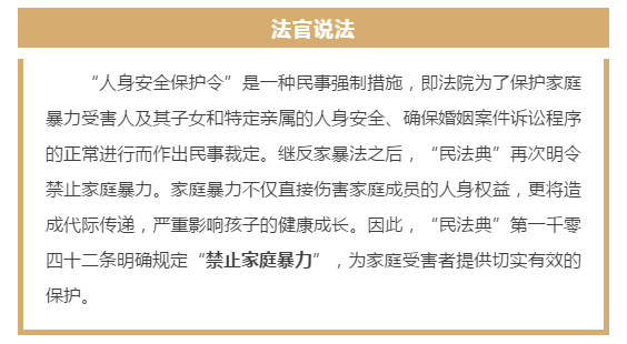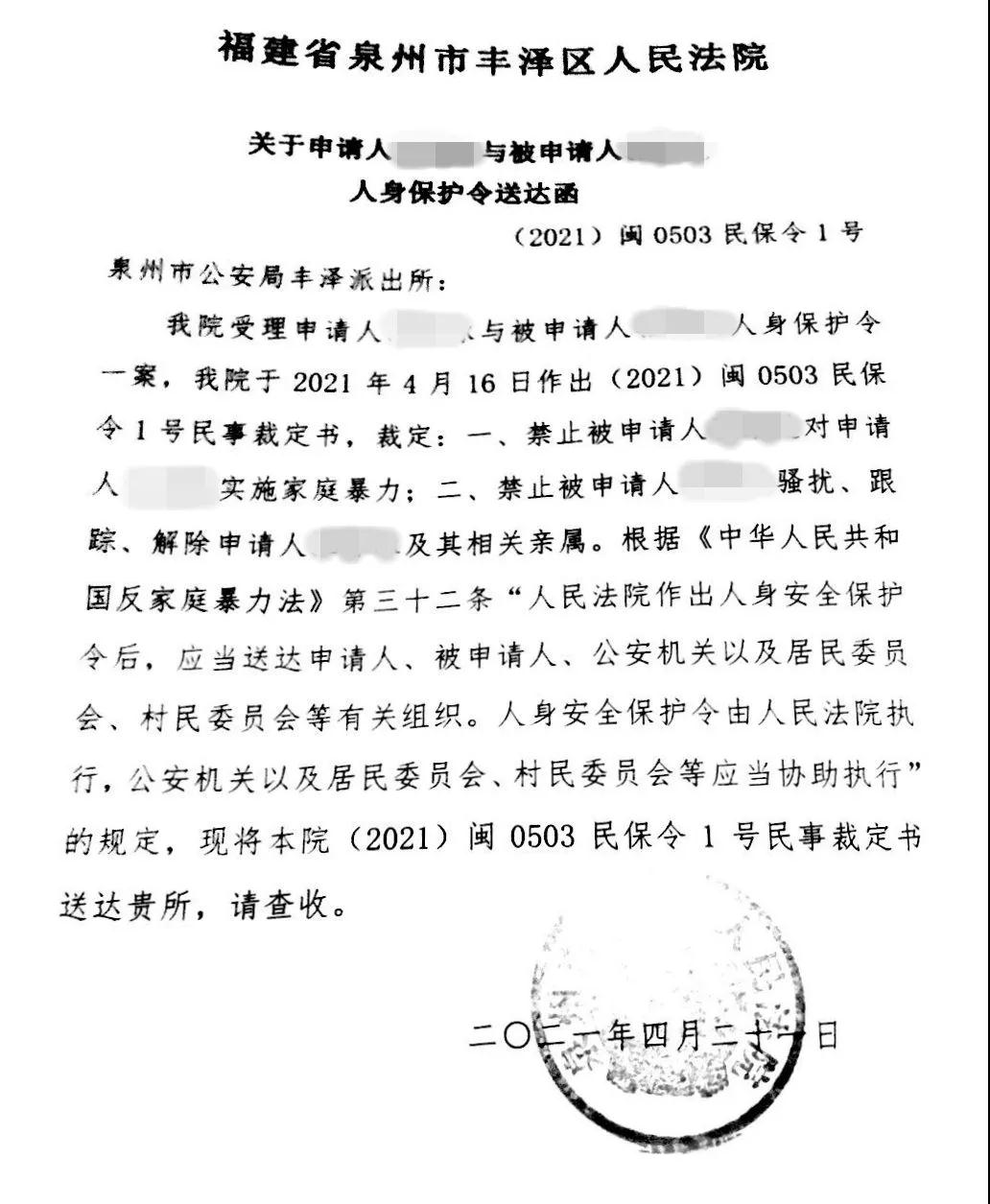 近日,豐澤法院發出2021年第一份人身保護令,也是繼今年1月1日《中華人民共和國民法典》(以下簡稱“民法典”)正式施行以來,豐澤法院從堅決反對家暴的角度出發,發出的首份人身保護令。