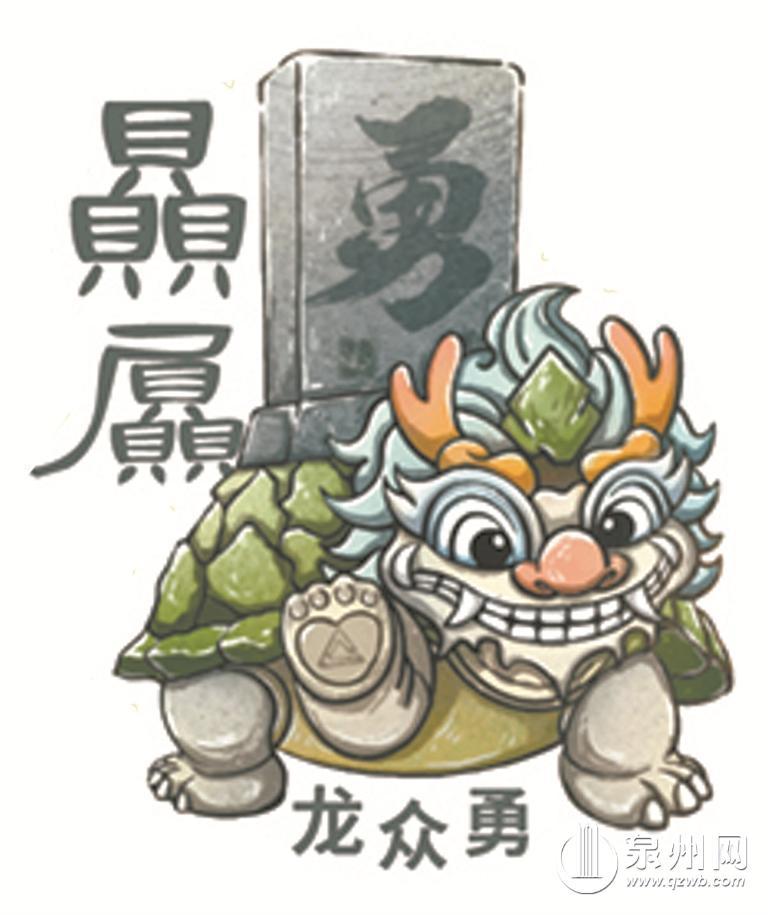 設(shè)計(jì)團(tuán)隊(duì)根據(jù)赑屃的特點(diǎn),背馱石碑,石碑的“勇”字突出閩南語(yǔ)諧音“龍眾勇”之意,勇在閩南語(yǔ)中代表著強(qiáng)壯,“龍眾勇”則是“大家身體都強(qiáng)壯”。