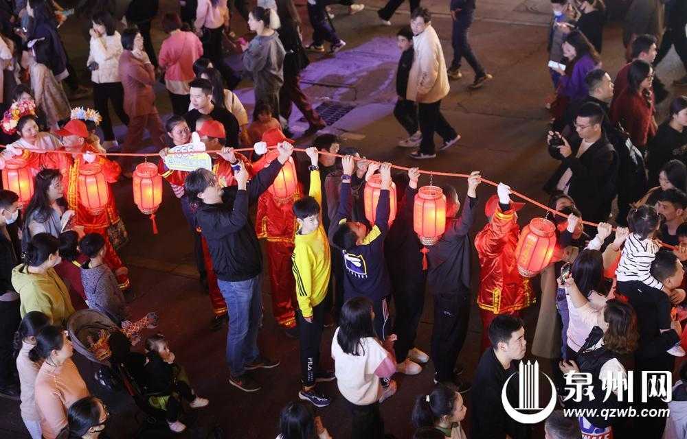 昨晚的游燈隊伍從泉州開元寺南大門出發,沿著西街一路巡游,行經泉州肅清門廣場,抵達泉州鐘樓。隊伍里的“燈首”,肩負麻繩,上身前傾,狀似拉纖,后面的人依次跟上,是為“拔燈”。“這次有30組燈隊共40人組成游燈隊伍,現場連成100米長的燈龍。”南安市英都鎮政府工作人員蘇先生介紹,相比每年農歷正月初九在英都舉辦的拔拔燈,這次過來參加的都是比較年輕的男村民,大伙積極配合。“燈龍約100米長,行進展示過程中,很多游客主動加入燈龍隊伍,站在燈龍的右側一起拔燈。讓更多人了解拔拔燈、了解泉州民俗,是活動最大的意義!”