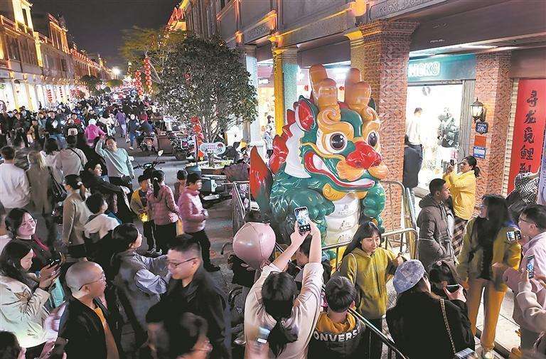 2月3日下午3時,“龍鯉鯉”小青龍亮相中山路通政巷,閩南古厝屋頂的“剪瓷龍”幻化為小青龍裝置,吸引了一大批市民游客前往打卡。這條小青龍憨態可掬,黃色龍角豎起,左拳豎起大拇指,綠色龍鱗上寫有閩南話“骨力”(勤勞的意思)、“趁大錢”(即賺大錢)、“起大厝”(蓋大房子的意思)、“敖”(即厲害)、“勇”(指身體強壯的意思)。