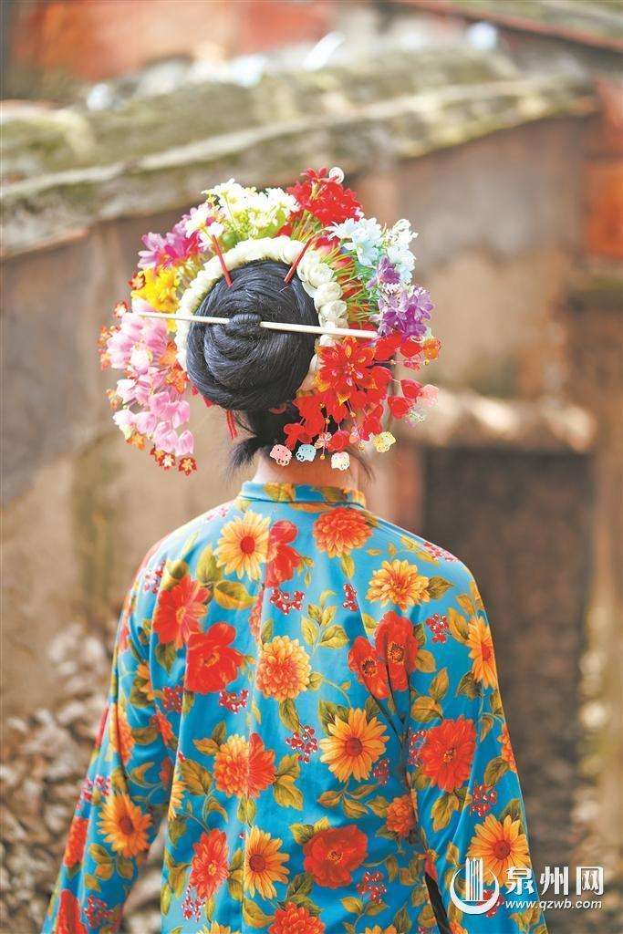 蟳埔女是福建三大漁女之一,至今仍保留著頭戴簪花圍的習俗。“蟳埔女自打孩提時期,便將頭發留長,系上紅繩,穿上骨髻,插上發釵,另用鮮花串成花環,圈戴在腦后,簪出一個‘頭上花園’,鮮艷芬芳。”黃麗泳是趙麗穎的造型師,多年來一直致力推廣蟳埔文化,她說,簪花圍承載著漁家人的情感與記憶,體現著蟳埔女的勤勞質樸以及對美好生活的向往。