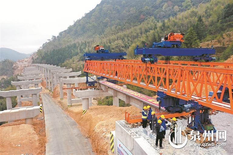 2月29日上午,政永高速公路德化段項目首片預制T梁,平穩架設在A2合同段溪美大橋左幅第19號墩和20號臺支座上。這標志著政永高速(德化段)建設邁入橋體梁片架設工序的新階段。(融媒體記者顏雅婷 通訊員顏志強 攝)