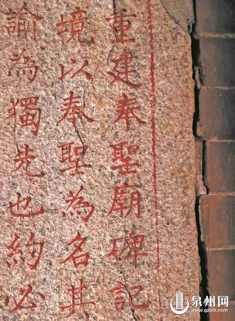 宮內(nèi)兩側(cè)墻壁上,各有一塊高大的石碑,高2米多,碑上楷書(shū)字刻用紅漆沿著邊緣描出文字,字跡斷斷續(xù)續(xù),碑面裂痕斑駁。泉州市文物保護(hù)研究中心曾鑒定,兩碑一塊是《奉圣約所碑》,一塊是《重建奉圣廟碑記》。