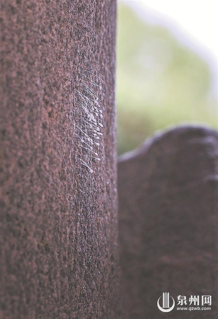 當(dāng)日,在泉州開元寺,慕名而來的人圍在弘一法師紀(jì)念館前的一根龍柱旁,仔細(xì)探看。貼身向前,石柱上立著一簇細(xì)小的白色物體,細(xì)長的枝梗向外探出,末端呈橢圓形,就像一顆小而長的蘑菇。