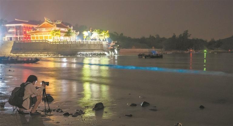 雖然天氣不算佳,但上個周末,石獅永寧、惠安凈峰等地紛紛出現(xiàn)了唯美“藍眼淚”,不少市民聞訊前往“追淚”。在石獅永寧梅林碼頭,有“追淚”的市民將小石子投到海浪中,泛起星星點點閃爍的藍光,仿若天上的星河墜入大海,夢幻又浪漫。