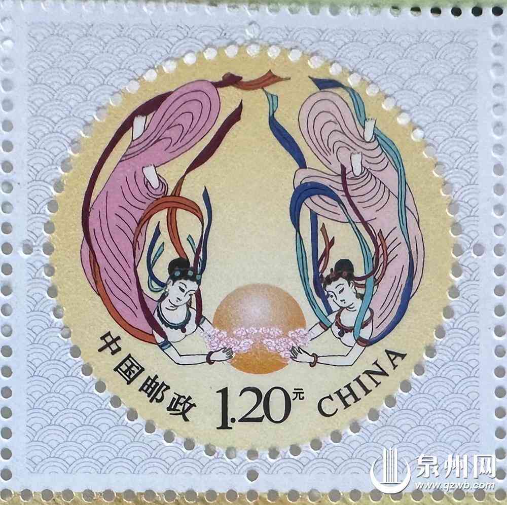 《洛陽橋》個(gè)性化郵票主圖選用“飛天”圖案,敦煌飛天與泉州飛天遙相呼應(yīng),陸上絲綢之路重鎮(zhèn)和海上絲綢之路起點(diǎn)共奏輝煌的盛世金曲。三枚版?zhèn)€性化郵票采取“天圓地方”雙齒孔設(shè)計(jì),蘊(yùn)含老子“三生萬物”的博大思想。在印制過程中,于油墨內(nèi)加入“海蠣殼粉末”,代表著洛陽橋在建造時(shí)使用“種蠣固基”生物技術(shù)工程的偉大創(chuàng)舉。