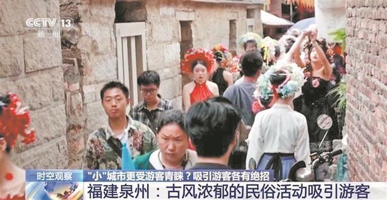 在4月30日,“五一”前夕,央視《東方時空》節目播出了《“小”城市更受游客青睞?吸引游客各有絕招》,報道中提到泉州富有古風濃郁的民俗活動,有深受游客追捧的簪花圍,有巧奪天工的閩南出磚入石古建筑,各地游客紛紛慕名前來“打卡”,體驗不一樣的踏青旅行。數據顯示,僅今年一季度,泉州文旅實現“開門紅”,全市接待游客總人數2192.6萬人次。