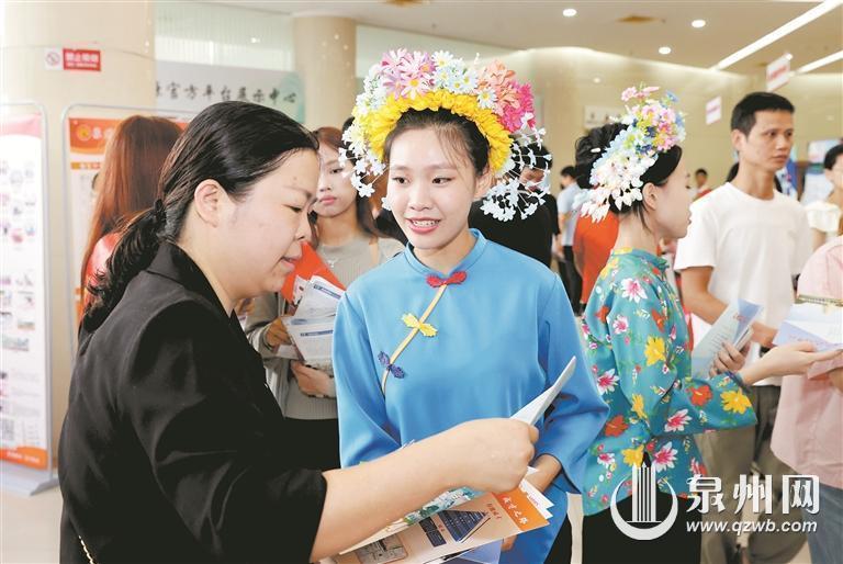 工作人員一身蟳埔女裝扮,贈(zèng)送學(xué)校資料服務(wù)招生。(張九強(qiáng) 攝)