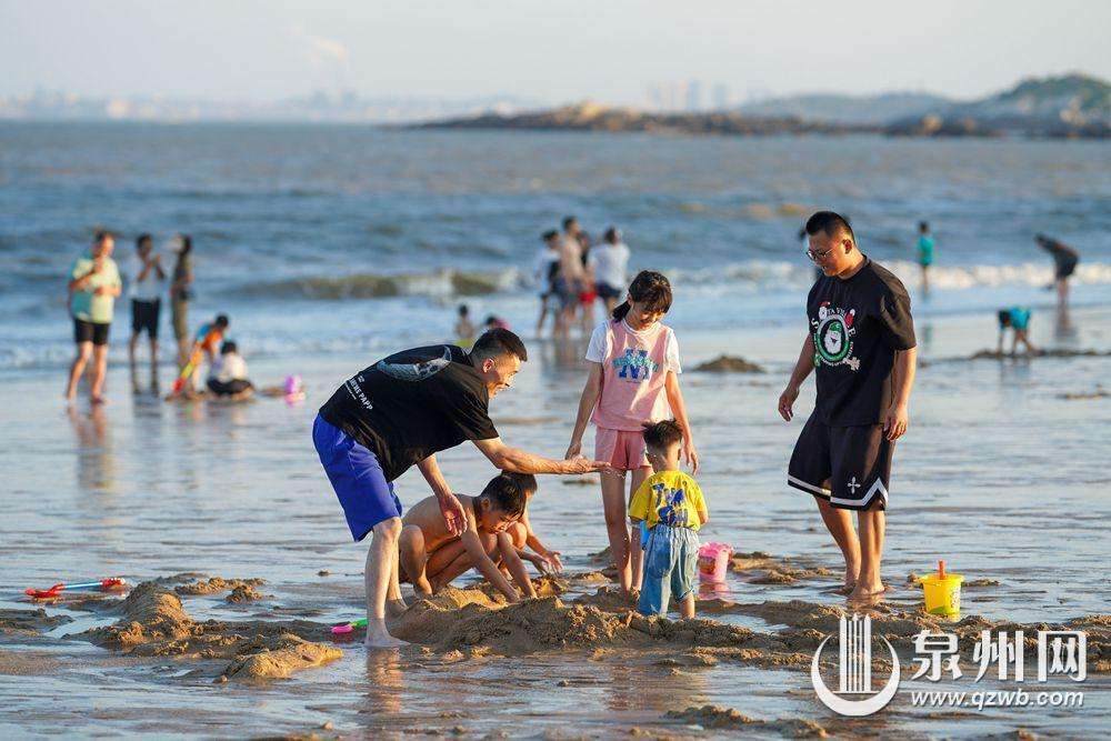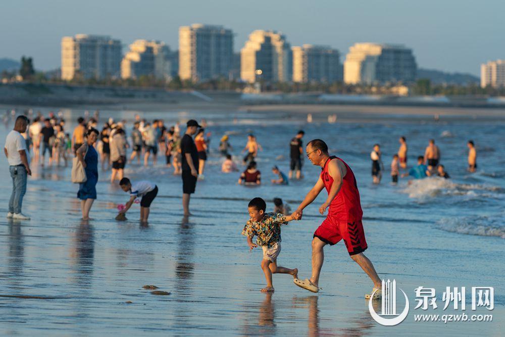 夏日高溫濱海游跟著升溫,連日來,一到傍晚,泉州臺商投資區玉沙灣公園的沙灘上總是游人如織。(陳起拓 攝)