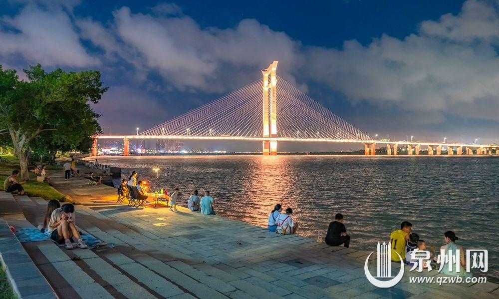 入夜時,在東海泰禾附近的江邊,人們坐在岸邊石階,吹著涼爽的江風,觀賞晉江大橋夜景,好不愜意。(陳起拓 攝)