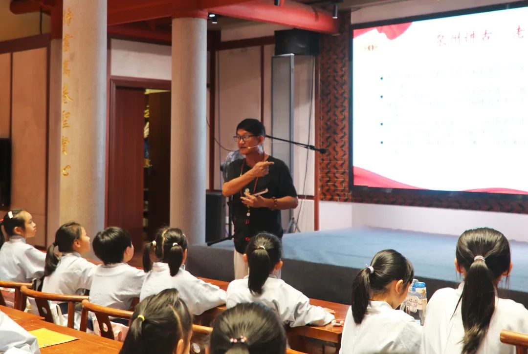“人之初,性本善。性相近,習(xí)相遠(yuǎn)……”現(xiàn)場,小學(xué)員們齊聲誦讀《三字經(jīng)》,以瑯瑯書聲為開筆禮畫上圓滿句號。隨后,孩子們迎來了暑托班的“第一課”,泉州非遺項目“閩南講古”代表性傳承人老鐵帶來《閩南講古》,用詼諧風(fēng)趣、聲情并茂的講述,帶領(lǐng)學(xué)員們感受泉州方言的獨特魅力。