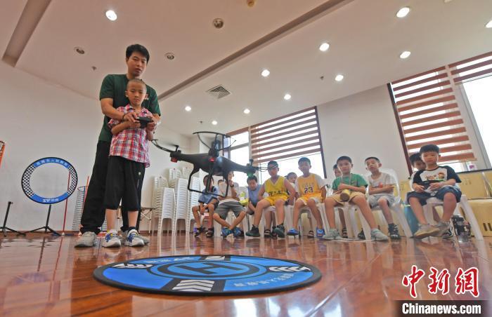 7月12日,泉州泉港區(qū),青少年在老師指導(dǎo)下練習(xí)無人機(jī)操控技巧。暑假來臨,當(dāng)?shù)亟處熃M成“公益”培訓(xùn)力量,分期分批為報(bào)名參訓(xùn)的青少年學(xué)生開設(shè)美術(shù)、音樂、舞蹈、書法等課程,既讓孩子們樂享假期生活,又有效為家長(zhǎng)“減負(fù)”。林弘梫 攝