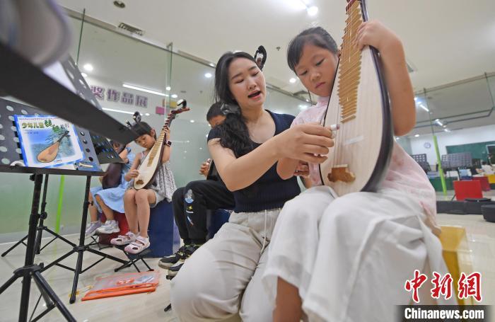 7月12日,泉州泉港區(qū),青少年在老師指導(dǎo)下練習(xí)琵琶彈奏。暑假來臨,當(dāng)?shù)亟處熃M成“公益”培訓(xùn)力量,分期分批為報(bào)名參訓(xùn)的青少年學(xué)生開設(shè)美術(shù)、音樂、舞蹈、書法等課程,既讓孩子們樂享假期生活,又有效為家長(zhǎng)“減負(fù)”。林弘梫 攝