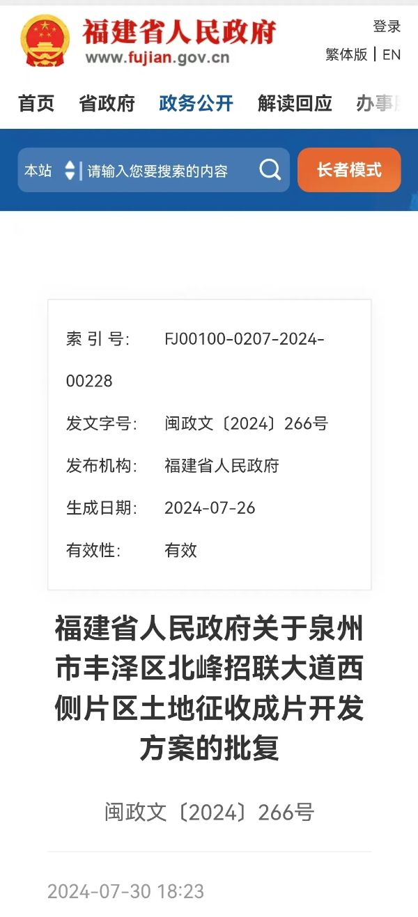 《泉州市人民政府關于泉州市豐澤區北峰招聯大道西側片區土地征收成片開發方案的請示》(泉政文〔2024〕54號)收悉。經研究,現批復如下: