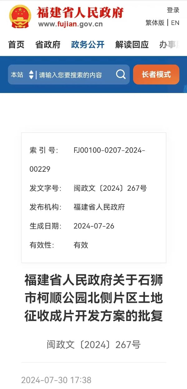 《石獅市人民政府關于石獅市柯順公園北側片區土地征收成片開發方案的請示》(獅政用地〔2024〕55號)收悉。經研究,現批復如下: