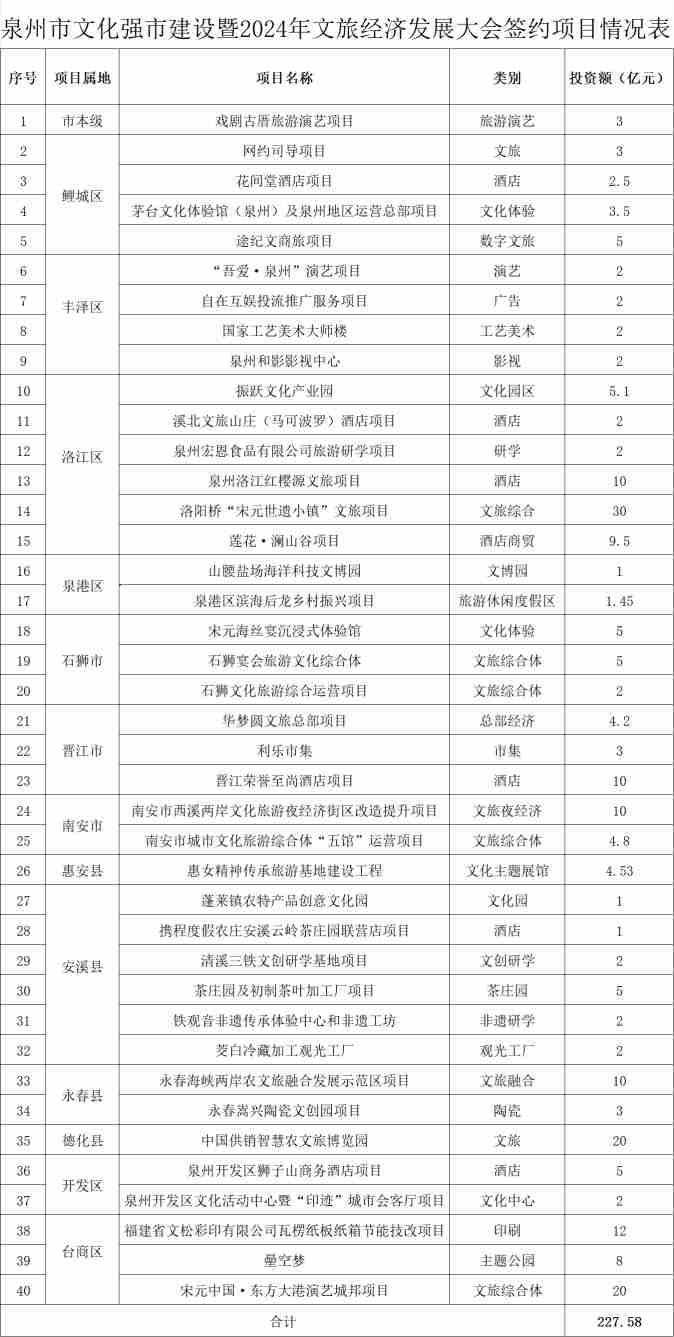 昨日,在泉州市文化強(qiáng)市建設(shè)暨2024年文旅經(jīng)濟(jì)發(fā)展大會(huì)上,40個(gè)重大文化產(chǎn)業(yè)項(xiàng)目、4個(gè)國(guó)際旅行商合作簽約,總投資227.58億元,涉及旅游演藝、酒店住宿、文化園區(qū)、總部經(jīng)濟(jì)、數(shù)字文旅、文旅商綜合體等多個(gè)領(lǐng)域和板塊。這些項(xiàng)目的簽約,將進(jìn)一步豐富優(yōu)質(zhì)文旅產(chǎn)品供給,助推我市文旅產(chǎn)業(yè)高質(zhì)量發(fā)展。
