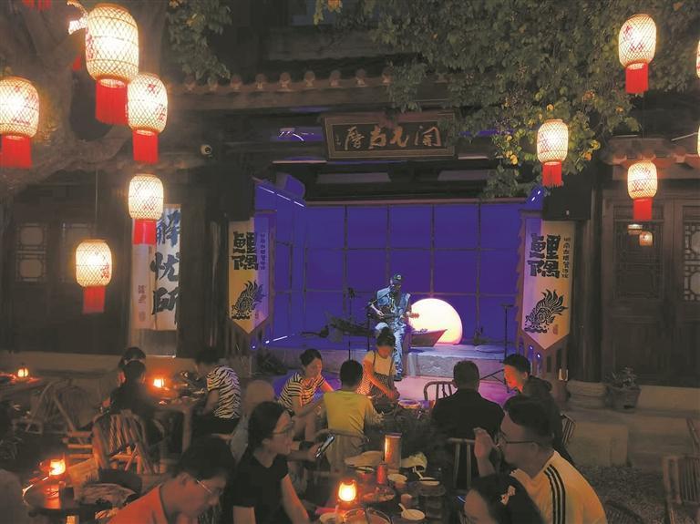 店內還可以看到很多裝飾融入了泉州非遺元素:吧臺前一只3.18米高的剪瓷片巨龍雕塑,墻面上的“滴水獸”、桌面上的“財神簽”,包間命名為“臨漳門”“朝天門”等等,都被創造性地融到了餐酒館的設計里面。店內還設置了小舞臺,這里定期進行南音、木偶戲、泉州民謠等表演,為顧客提供沉浸式的文化體驗。