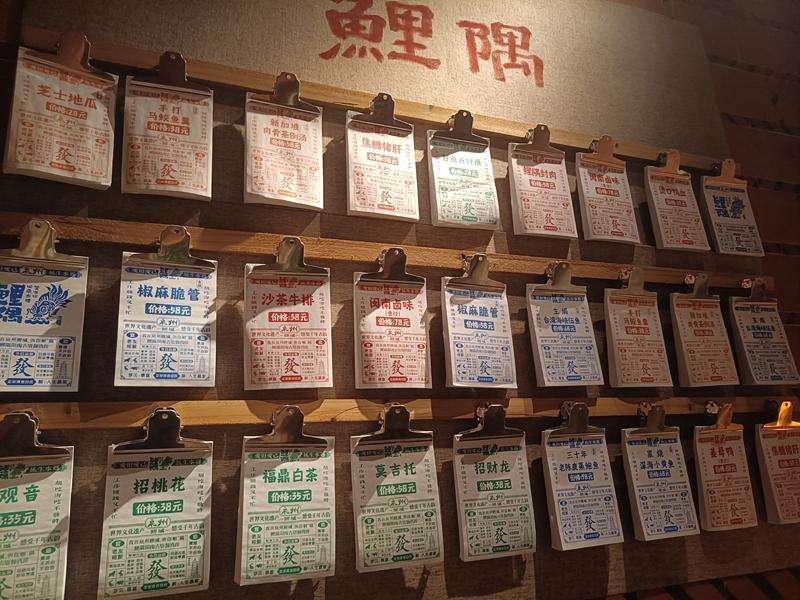 走進位于鯉城區新華北路的這家閩南古厝餐酒館,首先映入眼簾的是一幅放大版的老黃歷頁面招牌,白底紅字的設計結合了店鋪名稱“鯉隅”,下方標注著店鋪提供的各種服務,包括下午茶、餐酒、民謠演出、南音表演和民宿等。招牌旁邊是幾尊石獅子樣式的下馬樁,象征“迎接顧客回家”之意。往里走,一條縱深式的花燈長廊,兩邊的墻面上掛滿了花燈,店家說,這個設計的靈感來源于泉州是一座光明之城,取“萬家燈火”之意。走過一段小型石拱橋,迎面看到一面“日歷點單墻”,上面掛著滿滿的日歷本樣式的單子:“鐵觀音”“閩南鹵味”“招桃花”……各式各樣的招牌食品、飲料明碼標價供顧客自由選擇。