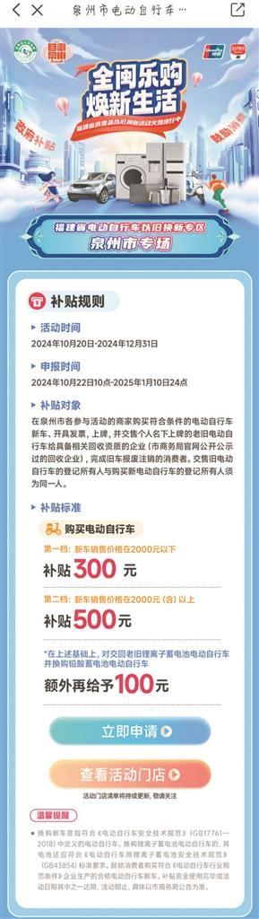記者從泉州市商務局獲悉,2024年泉州市電動自行車以舊換新政府補貼于10月20日正式啟動,活動持續至今年12月31日,補貼申報時間為2024年10月22日10點至2025年1月10日24點。目前,“云閃付”APP上可以查看到汽車、家電、家裝廚衛、電動自行車消費品以舊換新補貼的相關內容。符合電動自行車以舊換新補貼條件的個人消費者可通過銀聯“云閃付”APP首頁(需在云閃付注冊并實名認證綁定)進入“以舊換新應用-泉州專區-電動自行車以舊換新補貼”的申報入口,按系統提示填寫相關信息,并上傳資料。
