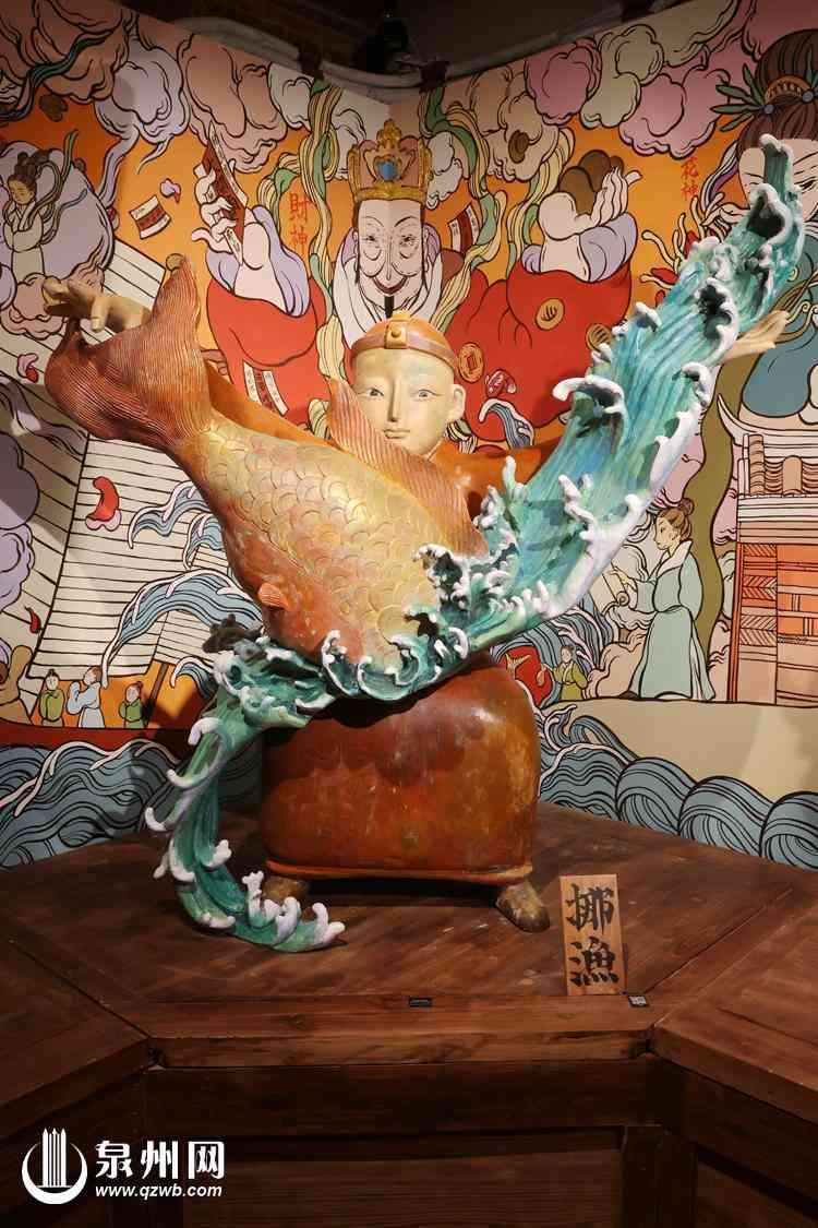 而這20多尊雕塑之外,藏海厝內(nèi)的匾額、燈籠、說(shuō)明文字,也全部由文那設(shè)計(jì)、制作。她說(shuō),很多雕塑背后藏有“彩蛋”等待被發(fā)現(xiàn)。比如:“挪漁”雕塑及其背后的壁畫(huà)貼有真正的金箔;“尋星”上的星星,是由螺鈿貼在墻上,它在海里是貝殼,在天上變成了星星;藏海厝里的燈籠上,均寫(xiě)有“藏海衍派”……
