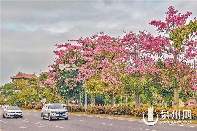 眼下,泉州市區江濱北路臨漳門至順濟橋路段,櫻花木棉開出粉色花朵,扮靚中分綠化帶,令人賞心悅目。據悉,櫻花木棉的樹干膨大,腆著“大肚子”,所以又被稱為酒瓶木棉、大腹木棉。