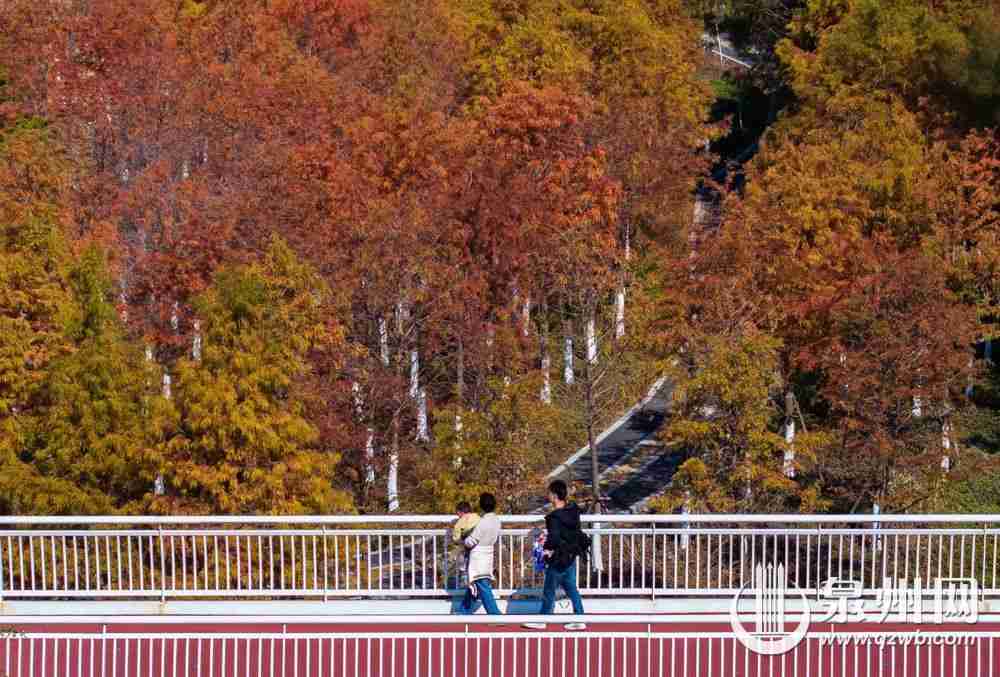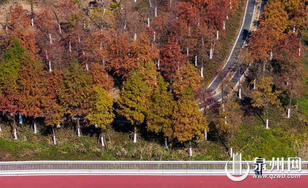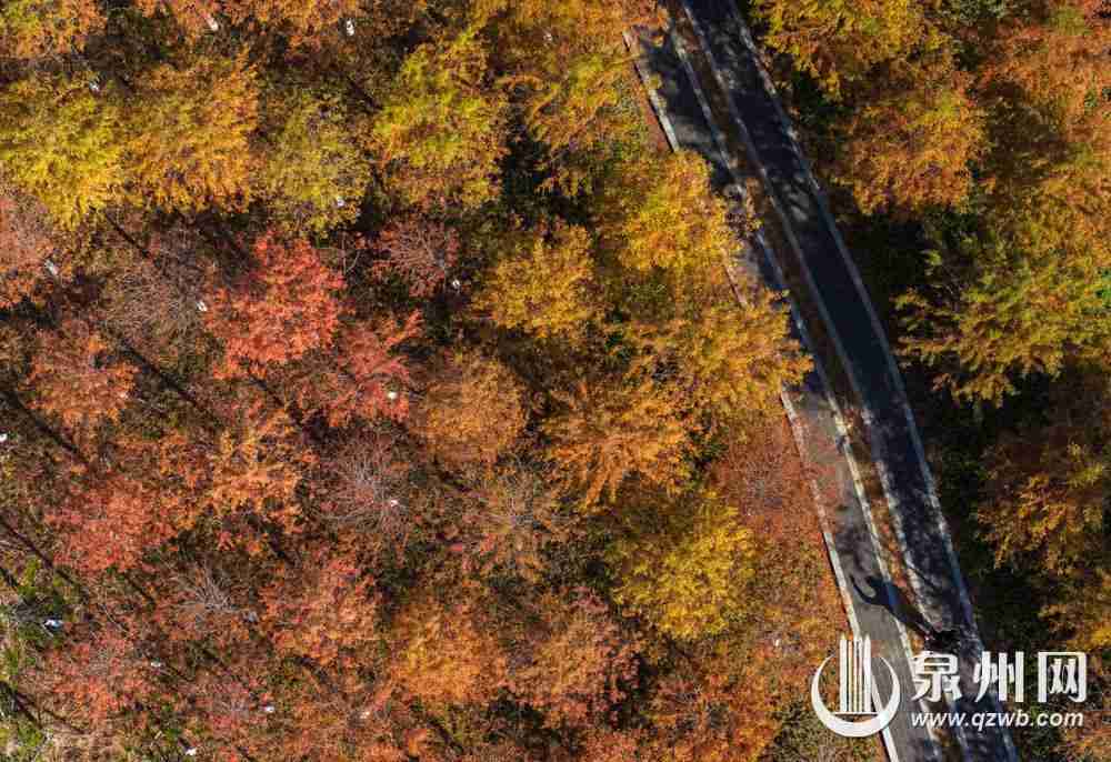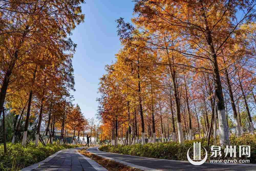 14日,在位于泉州臺商投資區南北大道旁的海絲生態公園里,落羽杉小樹林色彩斑斕,帶來冬日的別樣風景。(融媒體記者陳起拓 攝)