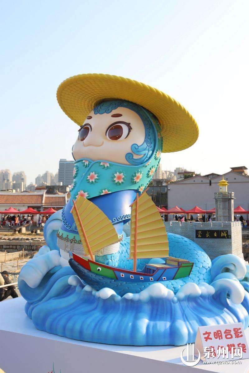 背靠崇武古城,面朝大海,伴著福船與海共生。“迎迎”整體呈現惠安女服飾特性:“封建頭、民主肚、節約衣、浪費褲”,金斗笠上以泉州特色簪花中的玉蘭、茉莉花和山茶花為點綴,象征惠安女的美麗、純潔與質樸。