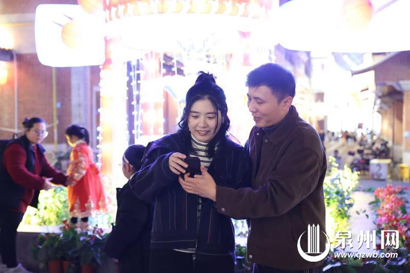 情侶們并肩而立,在花燈下輕聲猜謎,當一方猜出那句“眾里尋他千百度”的謎底時,相視一笑間,愛意在眉眼間流轉,滿是中式情人節獨有的含蓄與深情。不遠處,丈夫舉著相機,專注地捕捉妻子在花燈前的動人瞬間。那一刻,燈光與月光交織,她的笑容明媚奪目,比花燈還要絢爛。