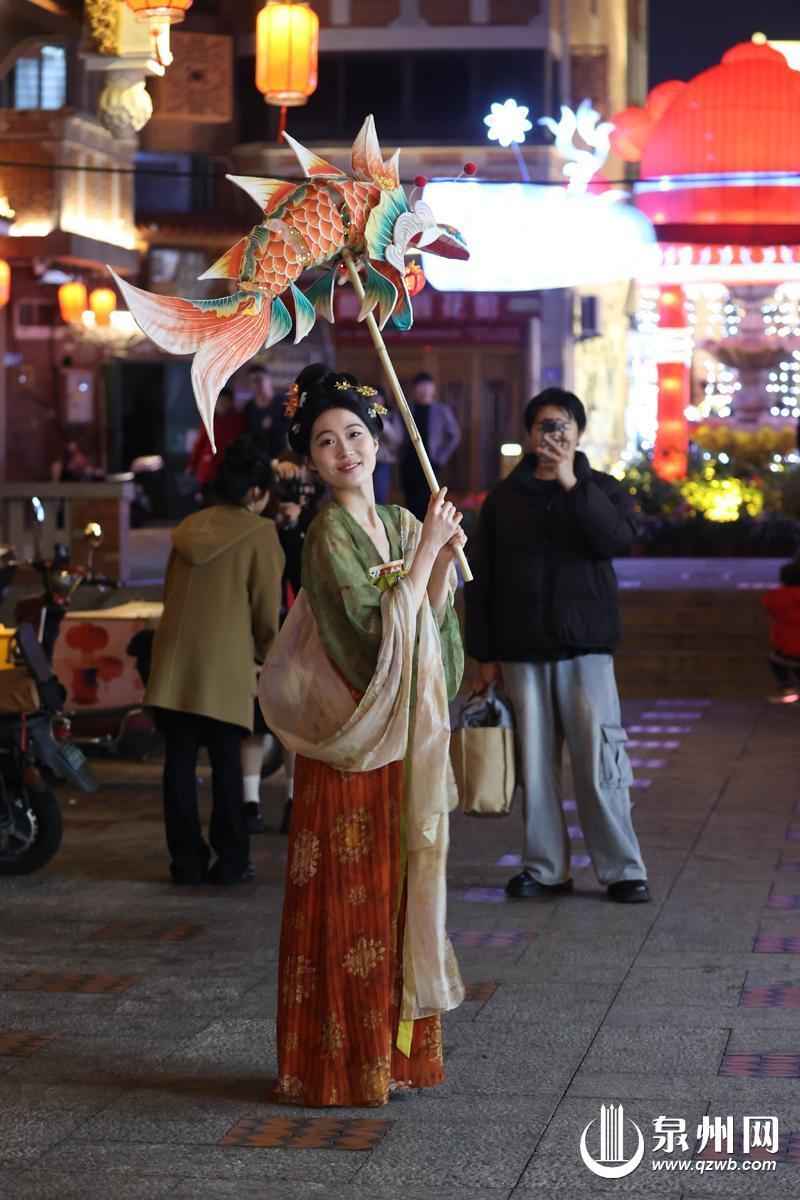 昨晚,暮色籠罩下的泉州古城,中山路的騎樓間,百盞花燈熠熠生輝,串起一條流淌的星河。月光輕柔地灑在開元寺東西塔上,為古老的建筑蒙上一層薄紗。青石板路上,漢服少女蓮步輕移,手中花燈與發間珠翠相互映襯,每一步都踏出古韻悠悠,仿佛是從千年的時光中走來。