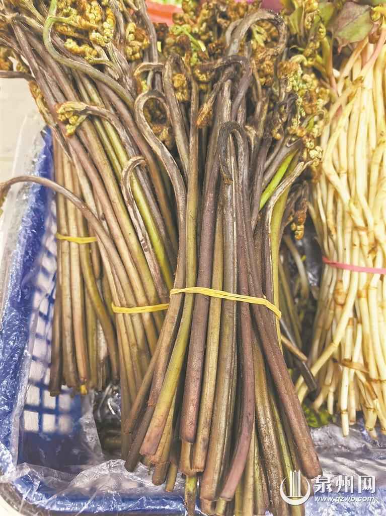 在隔壁菜店,老板娘把蕨菜、香椿、金線蓮擺在入口處最顯眼的位置。她介紹,這三種當中金線蓮賣得多,因為本地人燉湯喜歡用,其次便是香椿。“香椿一般是炒蛋,這幾年比較熱。”老板娘介紹,蕨菜六七把賣了兩天,不好賣。“蕨菜一般涼拌、炒臘肉,口感脆滑。”老板娘說。