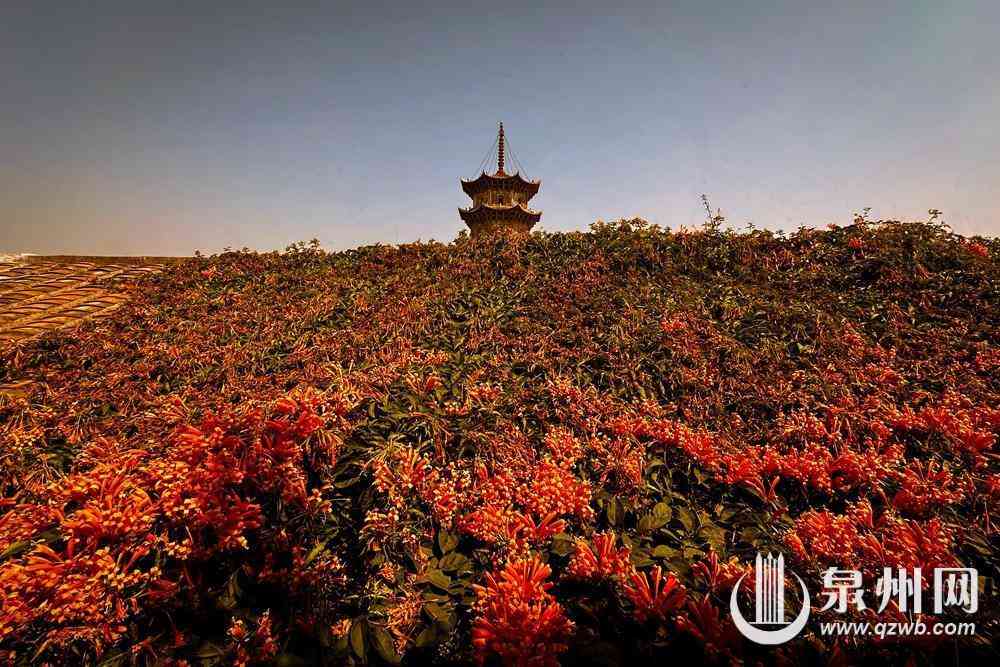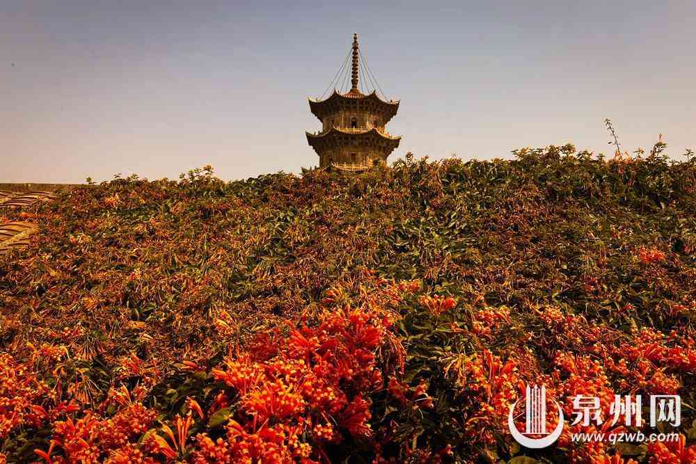 炮仗花的花期為3月至4月初,連日來,市區炮仗花迎來觀賞期,橙紅色如鞭炮一樣的花朵綻放在甲第門、井亭巷及古榕巷等街巷,為“半城煙火半城仙”的古城增添絢爛春意,吸引不少市民游客駐足打卡,記錄這份“橙”意滿滿的春日浪漫。圖為井亭巷民居屋頂盛開的炮仗花與開元寺的鎮國塔相映成趣。