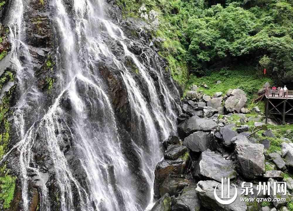 圖為游客們在泉州市洛江區虹山鄉觀賞虹山瀑布。(張九強 攝)