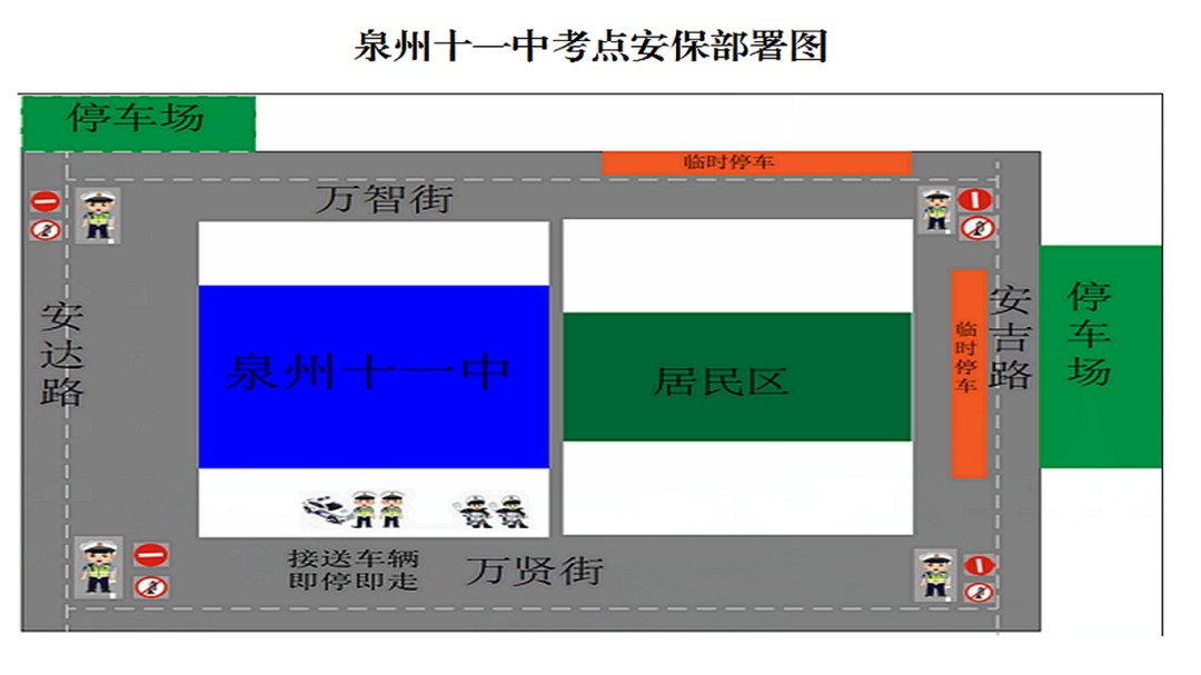 考試開始后,禁止車輛進入萬賢街安吉路路口至安達路路口路段、安達路萬賢街路口至萬智街路口路段。6月8日14:50—15:20英語聽力考試期間,提前管控,實行交通管制,嚴禁機動車進入萬賢街安吉路口至安達路口路段、安達路萬賢街路口至萬智街路口路段、萬智街安達路路口至安吉路路口路段通行、鳴笛。
