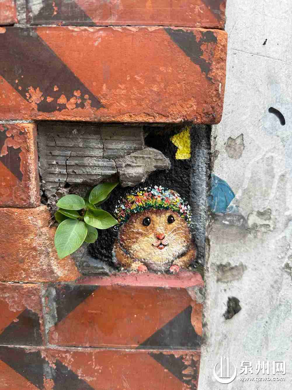 西街每天吸引著眾多游客前來打卡,但大多數人看開元寺、鐘樓時,卻錯過了一個藏在墻角的“小居民”。在西街中段一處圍墻的底部,藏著一只僅有巴掌大的“簪花小倉鼠”。它圓頭圓腦,雙眼溜圓,不張揚卻自帶治愈感,仿佛剛剛從墻洞里好奇地探出頭來,打量著這條千年古街。