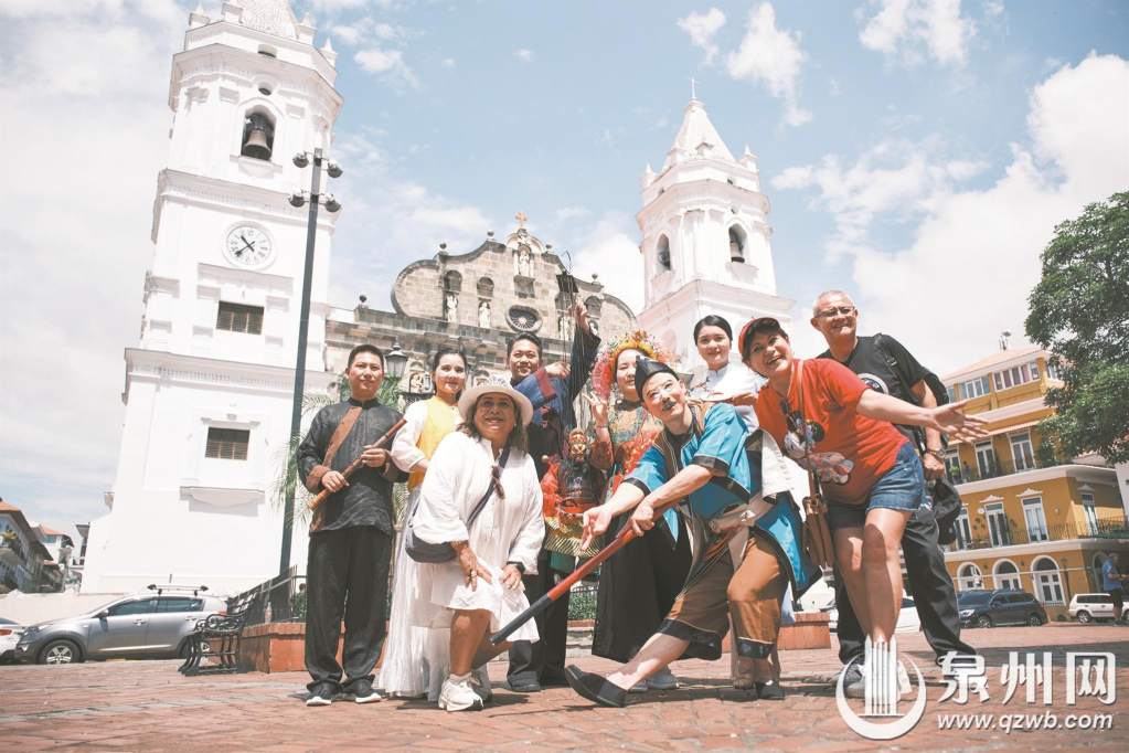9月22日,泉州文旅推介小分隊來到巴拿馬首都巴拿馬城開展“宋元中國 海絲泉州”文旅推介,在老城區(qū)海濱步道、巴拿馬城大教堂等人流聚集區(qū)開展快閃活動,讓當(dāng)?shù)鼐用窈陀慰土私怏w驗簪花、高甲戲、提線木偶等泉州傳統(tǒng)特色文化。圖為泉州文旅推介小分隊在巴拿馬城的大教堂前與當(dāng)?shù)赜慰秃嫌啊?/p>