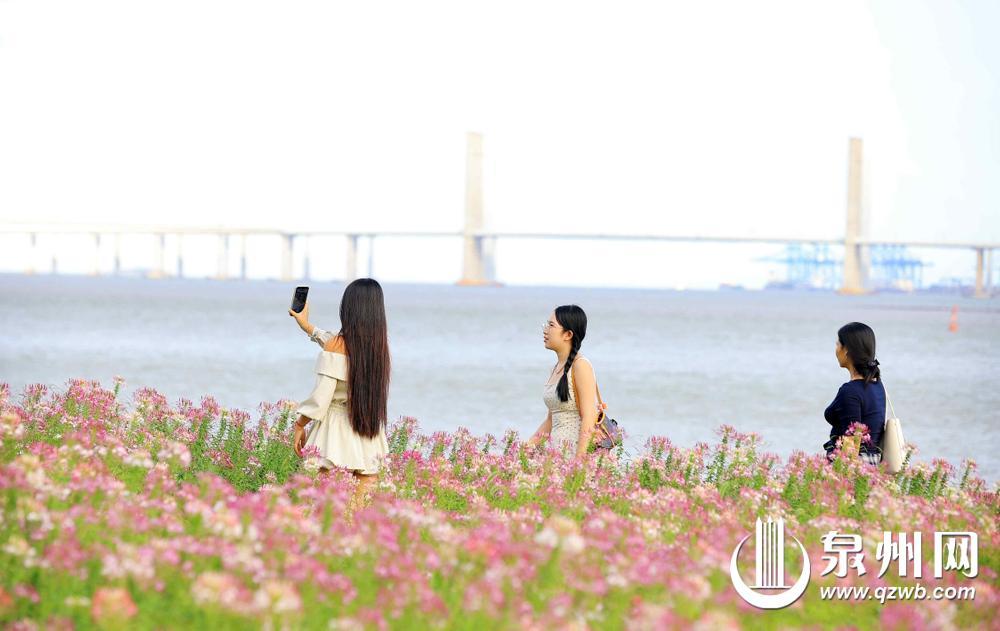 在市區濱海公園,市民紛紛在醉蝶花花海中拍照打卡。