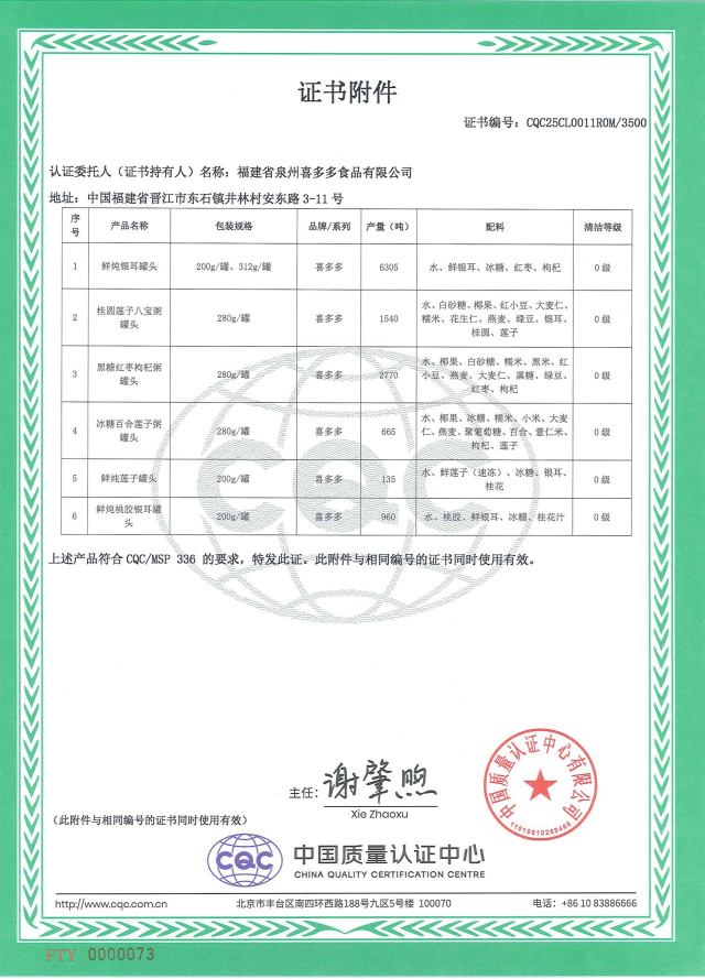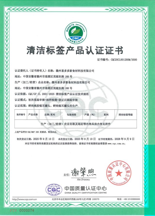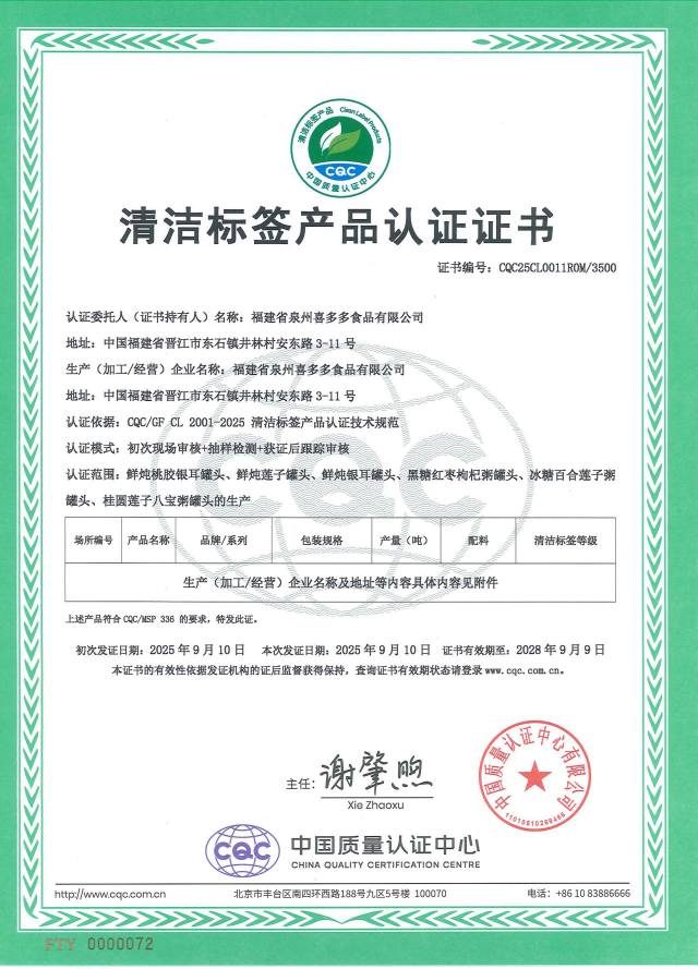 近日,喜多多正式獲得中國質量認證中心(CQC)頒發的國際清潔標簽產品認證證書。此次認證覆蓋旗下元氣粥系列(黑糖紅棗枸杞粥、冰糖百合蓮子粥、桂圓蓮子八寶粥)、鮮燉桂花蓮子罐頭、鮮燉桃膠罐頭、鮮燉銀耳罐頭六大核心產品,標志著喜多多在食品健康安全領域獲得了品牌權威認證機構認可,也是其踐行高標準質量管理的有力證明。