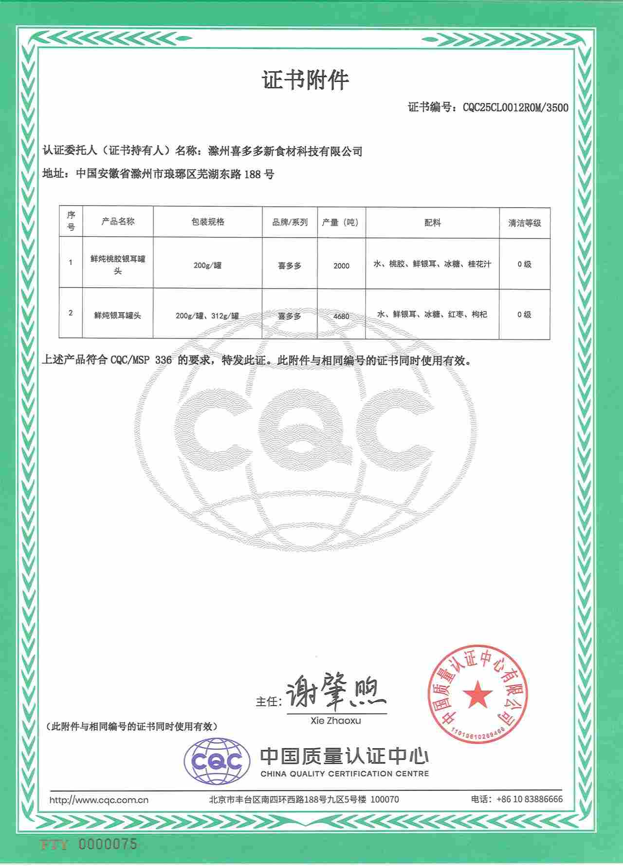在這一背景下,喜多多旗下產品元氣粥三款、鮮燉銀耳、鮮燉桂花蓮子、鮮燉桃膠,經中國質量認證中心(CQC)嚴謹檢驗檢查、通過數據調查審查,經憑借“零化學添加劑、配方極致簡化”的卓越表現,榮獲0級清潔標簽認證。這一認證是對喜多多在產品生產過程中堅持使用配方清潔化、減少化學添加劑以及推行綠色生產方式的肯定。