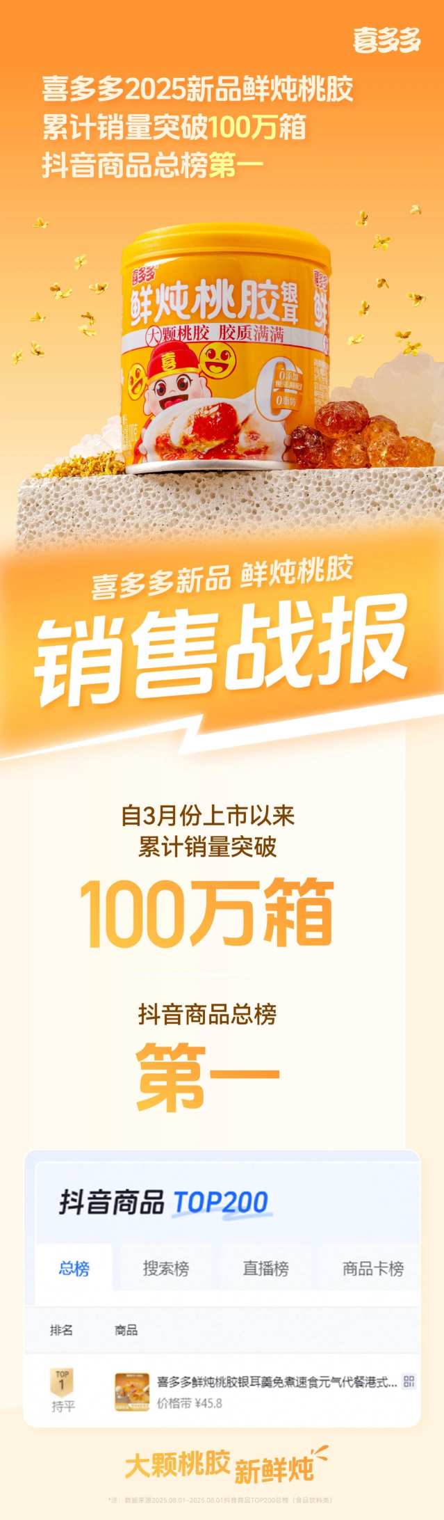 自2025年3月新品上市以來,喜多多清潔標簽系列——鮮燉桃膠銀耳迅速占據高端,累計銷量突破100萬箱,占據抖音商品總榜第一。