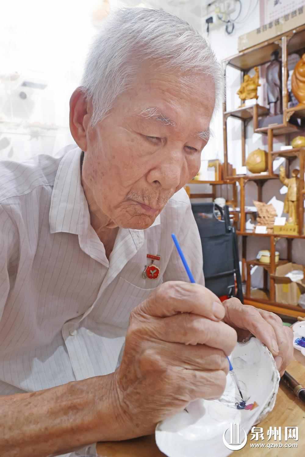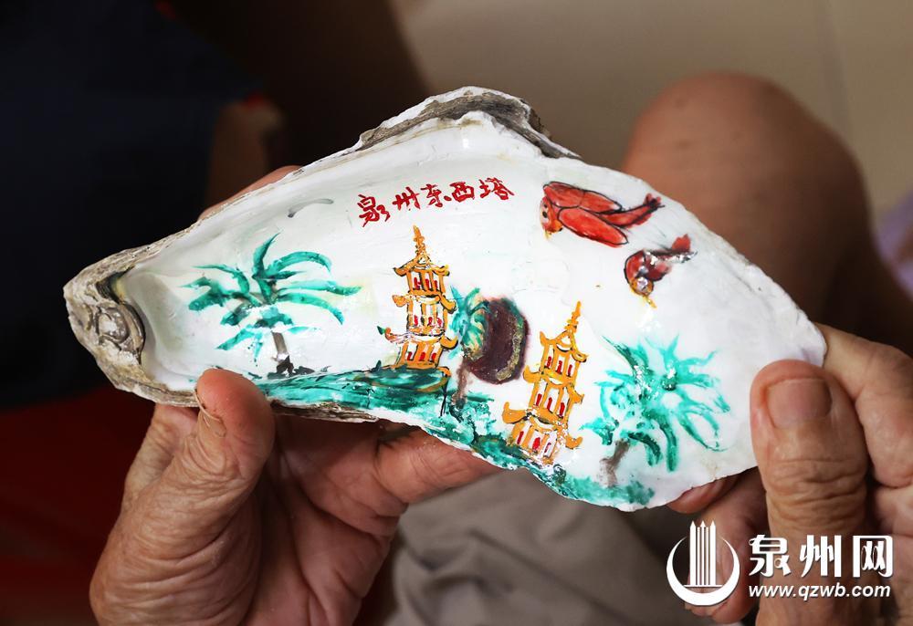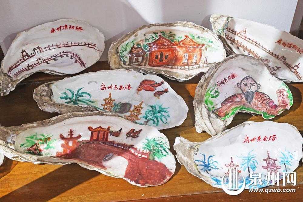 在洛陽橋南的一間小店里,一個特別的展柜陳列著數十枚生蠔殼,殼面上描繪著東西塔、洛陽橋、老君巖等泉州地標,以及各種花鳥圖案。這些獨特的畫作出自90歲的退休教師劉以符之手。